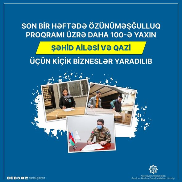 Əmək və Əhalinin Sosial Müdafiəsi Nazirliyinin tabeliyindəki Dövlət Məşğulluq Agentliyinin icra etdiyi özünüməşğulluq proqramı çərçivəsində şəhid ailələri və qazilər üçün kiçik təsərrüfat və müəssisələrin yaradılması işləri davam etdirilir.