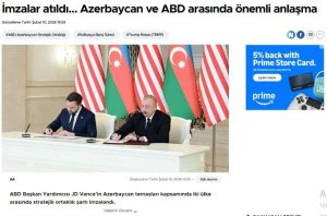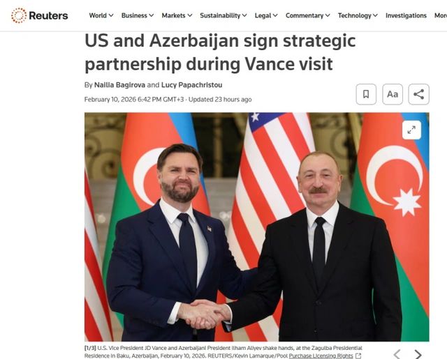 Bununla yanaşı, “Reuters”də dərc olunmuş “ABŞ və Azərbaycan Vensin səfəri çərçivəsində strateji tərəfdaşlıq müqaviləsi imzalayıblar” sərlövhəli yazıda qeyd olunur ki, Azərbaycan Prezidenti İlham Əliyev mətbuata birgə bəyanat zamanı ABŞ və Azərbaycan arasında münasibətlərin bu gün tamamilə yeni mərhələyə qədəm qoyduğunu deyib. Yazıya əsasən, Vens bildirib ki, ABŞ Azərbaycana ərazi sularını qorumaq üçün gəmilər göndərəcək. Vurğulanır ki, Xartiya ilk dəfə avqust ayında Vaşinqtonda Prezident İlham Əliyevlə Prezident Donald Tramp arasında danışıqlarda təqdim olunub.