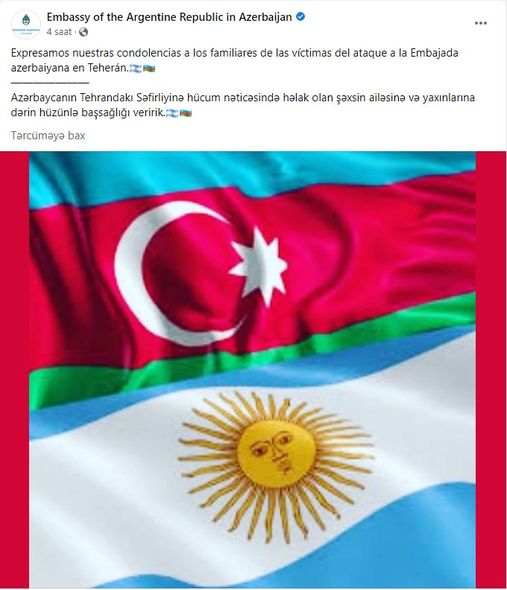 Argentinanın Azərbaycandakı səfirliyi Tehranda baş verən terror hadisəsi ilə bağlı paylaşım edib.