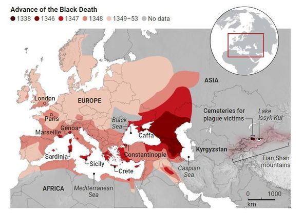 Müasir Qırğızıstan ərazisində yerləşən orta əsrlərə aid məzarlıqlardakı insan qalıqlarının DNT-sini sekvensiyası 14-cü əsrdə “qara ölüm” adlanan taun epidemiyasının məhz buradan Avropaya keçdiyini göstərir.