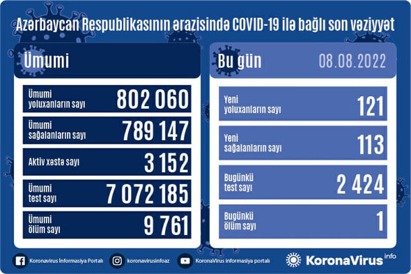 Azərbaycan Respublikasında koronavirus (COVID-19) infeksiyasına 121 yeni yoluxma faktı qeydə alınıb, 113 nəfər müalicə olunaraq sağalıb.