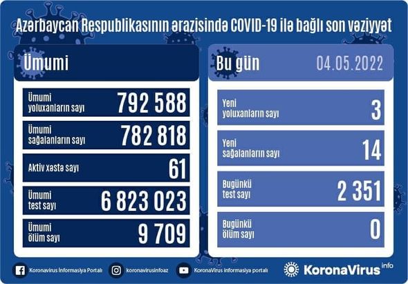 Azərbaycanda koronavirus infeksiyasına 3 yeni yoluxma halı qeydə alınıb, 14 nəfər müalicə olunaraq sağalıb.