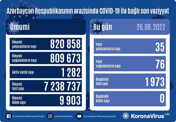 Azərbaycanda indiyədək ümumilikdə 820 858 nəfərin koronavirus infeksiyasına yoluxması faktı müəyyən edilib. Onlardan 809 673 nəfər müalicə olunaraq sağalıb, 9 903 nəfər vəfat edib, aktiv xəstə sayı 1 282 nəfərdir.
