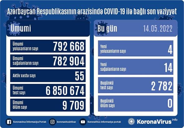 Azərbaycan Respublikasında son sutka ərzində koronavirus (COVID-19) infeksiyasına dörd yeni yoluxma faktı qeydə alınıb, 14 nəfər müalicə olunaraq sağalıb.