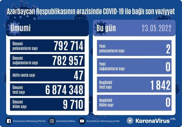Azərbaycanda indiyədək ümumilikdə 792 714 nəfər koronavirus infeksiyasına yoluxub. Onlardan 782 957 nəfər müalicə olunaraq sağalıb, 9 710 nəfər vəfat edib, aktiv xəstə sayı 47 nəfərdir.