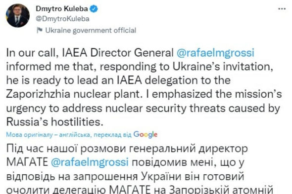 “Söhbətimiz zamanı BAEA-nın baş direktoru Rafael Mariano Qrossi bildirdi ki, Ukraynanın dəvətinə cavab olaraq Zaporojye AES-ə gedəcək nümayəndə heyətinə rəhbərlik etməyə hazırdır. Mən Rusiyanın nüvə təhlükəsizliyi ilə bağlı yaratdığı təhdidlər səbəbindən missiyanın işinin aktuallığını vurğuladım”, – Kuleba qeyd edib.