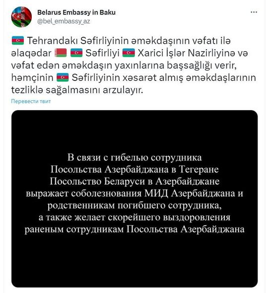 “Azərbaycanın Tehrandakı səfirliyinin əməkdaşının həlak olması ilə bağlı başsağlığı veririk”.