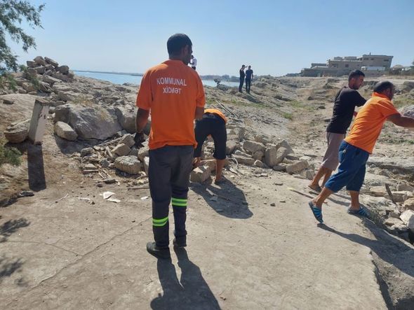 Ərazidə texnikanın dağıtdığı tikintilərin qalıqlarını şəhər və rayonun Mənzil Kommunal Təsərrüfat Birliyinin əməkdaşları təmizləyirlər.