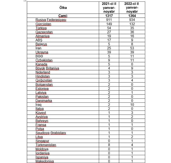 2022-ci ilin yanvar-noyabr ayları ərzində 1364 nəfər əcnəbi Azərbaycandan daşınmaz əmlak alıb. 2021-ci ilin müvafiq dövründə satılan əmlakların sayı isə 1317 təşkil edib.