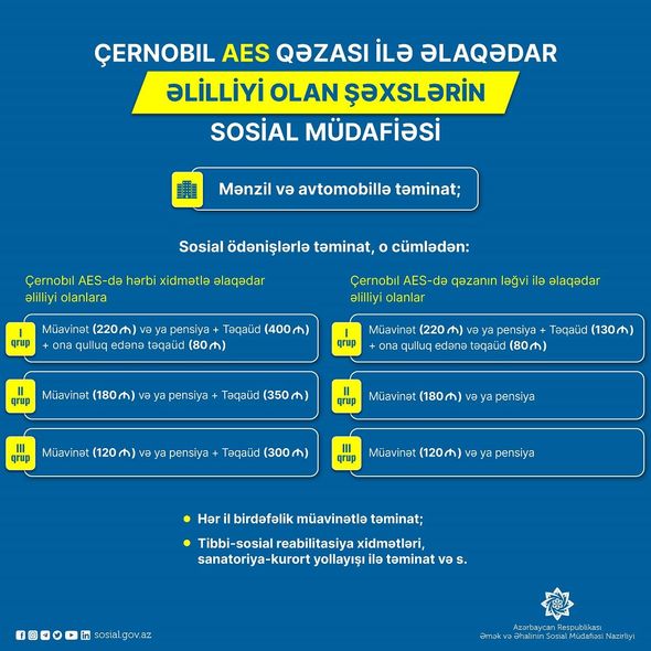 Çernobıl AES-də hərbi xidmətlə əlaqədar əlilliyi olan şəxslərə Prezidentin aylıq təqaüdü (I dərəcə üçün 400 manat, II dərəcə üçün 350 manat, III dərəcə üçün 300 manat) ödənilir. Çernobıl AES-də qəzanın ləğvi ilə əlaqədar I dərəcə əlilliyi olan şəxslər də Prezidentin aylıq təqaüdü (130 manat) ilə təmin olunur.
