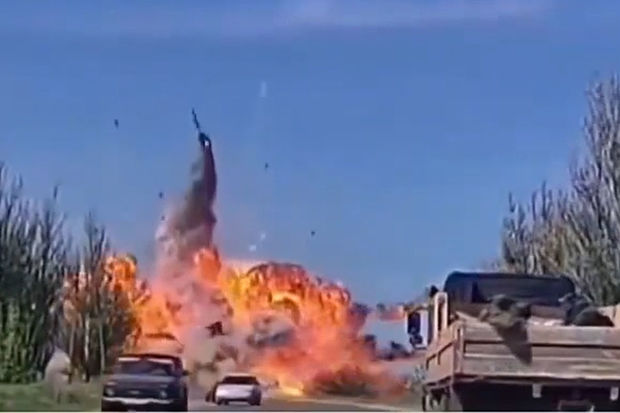 Kadrlarda tankın Ukraynaya məxsus qırıcılar tərəfindən vurulması və partlaması əks olunub.