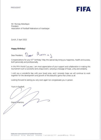 FIFA-nın prezidenti Canni İnfantino AFFA prezidenti Rövnəq Abdullayevə məktub göndərib.