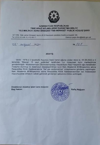 Amma bildirdilər ki, onlar yalnız “Ə.D.Məlikov adına Binəqədi Tibb Mərkəzi”nə göndəriş verə bilərlər. Göndəriş alıb mərkəzə getdim, həkimin qəbulunda təxminən iki saat gözləyəndən sonra qulağımı müayinə etdi. Qulaqda ağrıya və eşitmə zəifliyinə səbəb olacaq hər hansı problem olmadığını bildirdi. Amma diaqnozun dəqiqləşdirilməsi üçün məni A.Mirqasımov adına Respublika Klinik Xəstəxanasına göndəriş verəcəyini bildirdi.