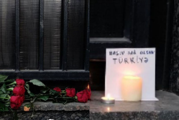 Onlar səfirliyin qarşısında “Başın sağ olsun, Türkiyə” yazılmış kağızlar qoyur, şamlar yandıraraq zəlzələ qurbanlarını yad edirlər.