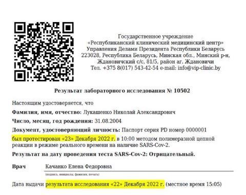 Onlar Aleksandr Lukaşenko və oğlu Nikolay tərəfindən verilən koronavirus üçün PCR testlərinin nəticələrini dərc ediblər.