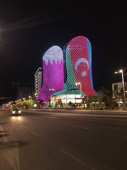 Azərbaycan Respublikasının milli bayramı – Müstəqillik Günü münasibətilə Qətərin paytaxtı Doha şəhərindəki “Al Jaber Twin Tower” əkiz qüllələri Müzəffər Ali Baş Komandan, Prezident İlham Əliyevin və Qətər Əmiri Şeyx Təmim Bin Hamad Al Taninin şəkilləri, ölkəmizin dövlət atributu olan bayraq, zəfər simvolumuz olan xarıbülbül loqosu və “Müstəqillik Gününüz mübarək” yazısı ilə işıqlandırılıb.