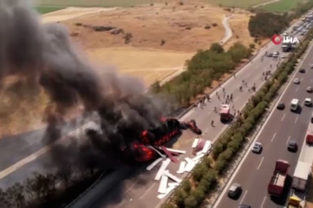 Türkiyənin İzmir şəhərində baş verən yol qəzasından sonra ot tayası daşıyan yük maşını alova bürünüb.