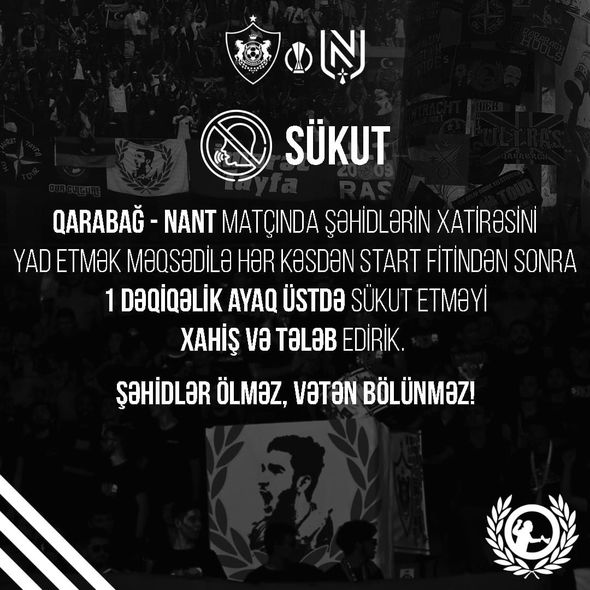 “Qarabağ”-“Nant” matçında şəhidlərin xatirəsini yad etmək məqsədi ilə hər kəsdən start fitindən sonra bir dəqiqəlik ayaq üstdə sükut etməyi xahiş və tələb edirik. Şəhidlər ölməz, Vətən bölünməz!”