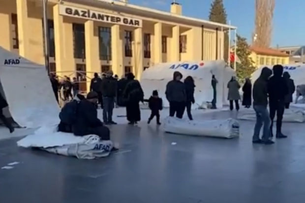 Türkiyənin Qaziantep şəhərinin mərkəzində zəlzələ qurbanına çevrilən vətəndaşların müvəqqəti gecələmələri üçün çadırlar qurulur.