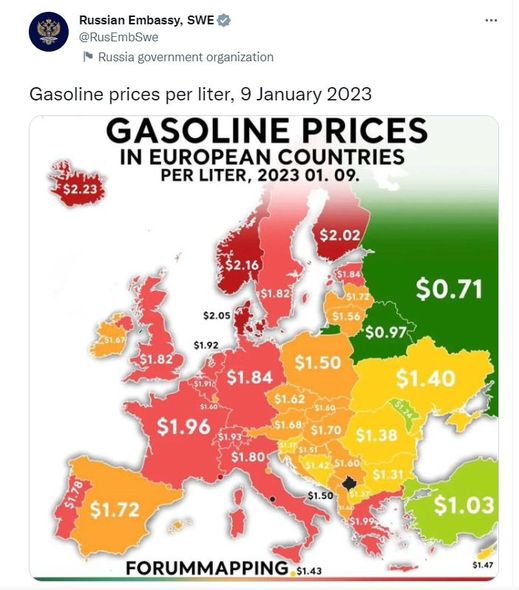 Xəritədə Avropanın müxtəlif ölkələrində benzinin qiymətləri göstərilib. Müvəqqəti olaraq işğal olunmuş ərazilər də daxil olmaqla bütün Ukrayna sarı rənglə qeyd olunub.