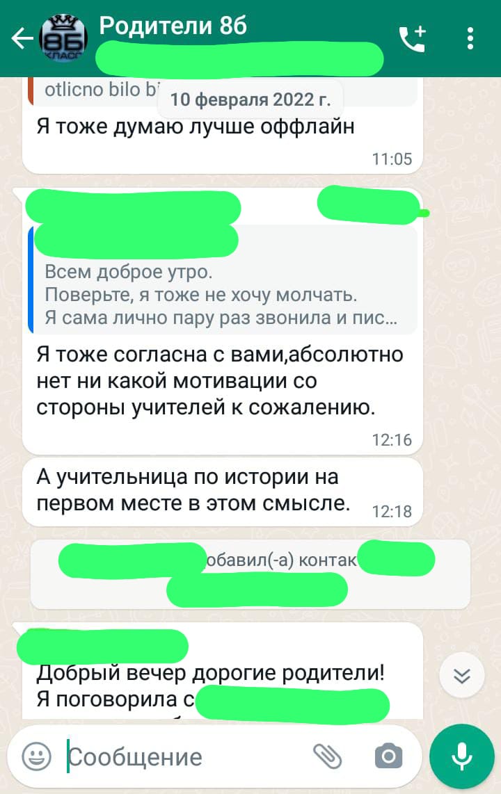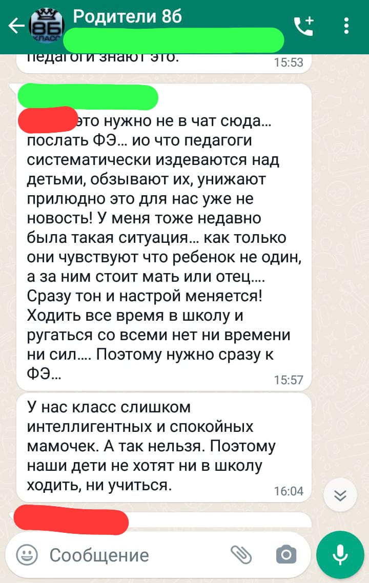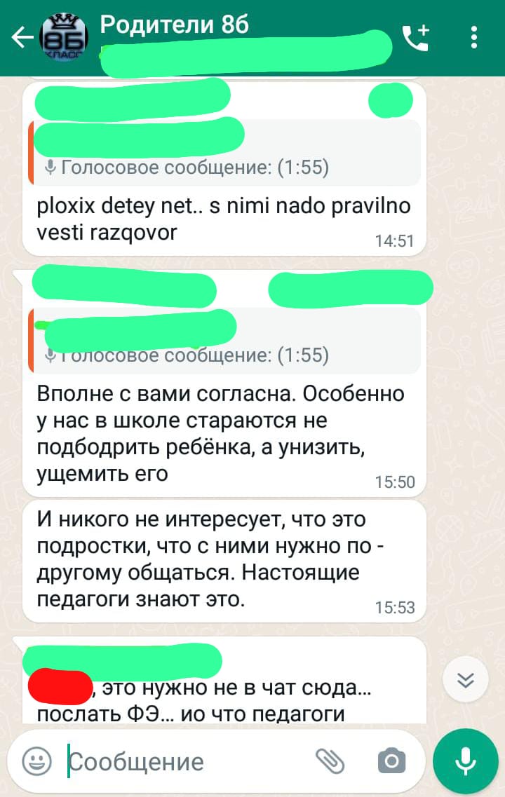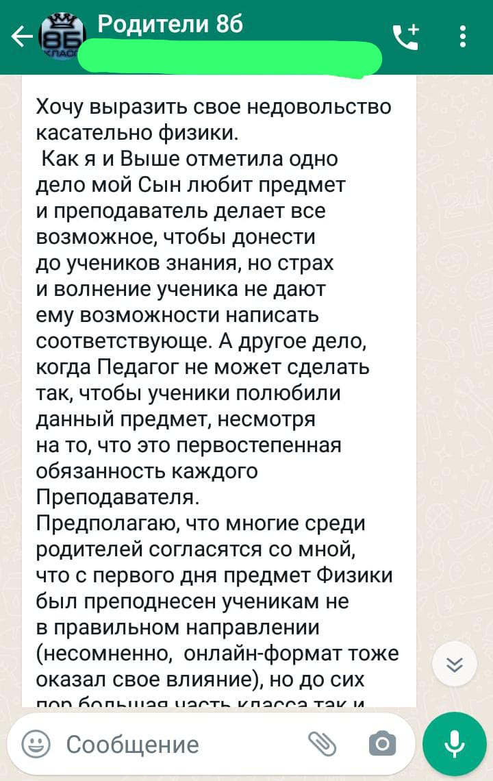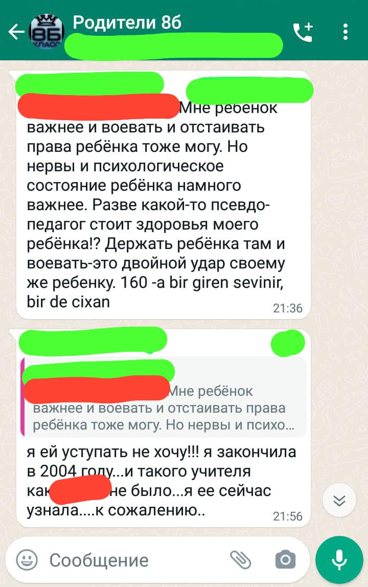 “Böyük qızının da “iki”ləri olub, amma o qədər də çox deyildi. Müəllimlərimiz ona dəstək oldu, qız özünü toparladı və Moskva Dövlət Universitetinə daxil oldu. Anası minnətdarlıq etmək üçün yanıma gəlmişdi, indi də məktəbimizi biabır edir. Baxmayaraq ki, onun özü uşağının oxumasına nəzarət etmir”.