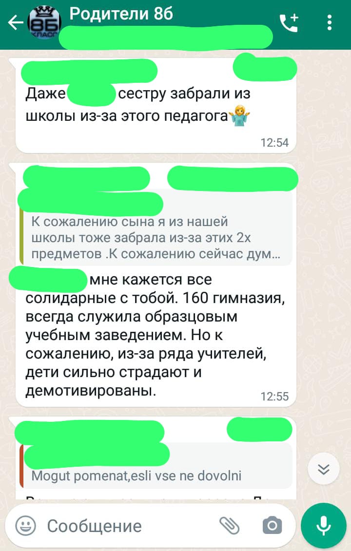 “160 saylı Klassik Gimnaziyanın müəllimləri qızımı alçaldır, qiymətlərini aşağı salır və rüşvətə eyham vururlar. Mən onu başqa bir təhsil müəssisəsinə köçürmək qərarına gəldim, amma məktəb direktoru sakit getməyimizə imkan vermir”.