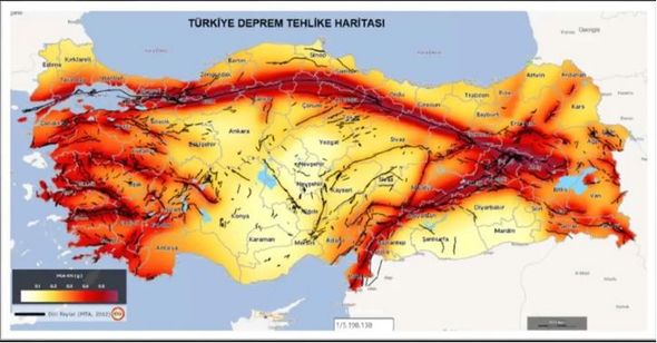 AFAD (Türkiyə Daxili İşlər Nazirliyinin Zəlzələ İdarəsi) tərəfindən Türkiyədə zəlzələ təhlükəsinin ən çox olduğu bölgələrin əks olunduğu xəritə təqdim edilib.