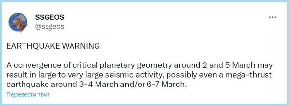 “Martın ilk həftəsi çox kritik dövrdür. Ayın 2-də 9 saat ərzində Yer də daxil olmaqla Merkuri və Saturn arasında planetar birləşmə baş verəcək. Bu çox vacibdir. Nəticədə, ayın 3-ü və ya 4-ü ərzində böyük seysmik hadisə baş verə bilər. Bu, ayın 6-dan 7-nə kimi də ola bilər. Mən şişirtmirəm, qorxu yaratmağa çalışmıram. Bu bir xəbərdarlıqdır. Çünki planet yaxınlaşmasının seysmik hadisələrə səbəb olduğu məlumdur. Biz buna ciddi yanaşmalıyıq”, – deyən “zəlzələ kahini” martın ilk həftəsi üçün proqnozlaşdırdığı zəlzələnin 7 və 8 baldan yuxarı ola biləcəyini vurğulayıb.