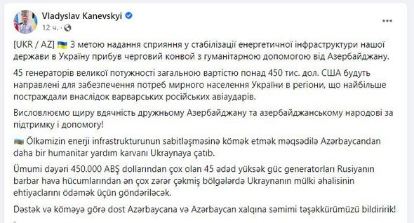 “Ümumi dəyəri 450 000 ABŞ dollarından (765 000 min manat) çox olan 45 ədəd yüksək güc generatorları Rusiyanın hava hücumlarından ən çox zərər çəkmiş bölgələrdə Ukraynanın mülki əhalisinin ehtiyaclarını ödəmək üçün göndəriləcək. Dəstək və köməyə görə dost Azərbaycana və Azərbaycan xalqına səmimi təşəkkürümüzü bildiririk!” – deyə Kanevski qeyd edib.