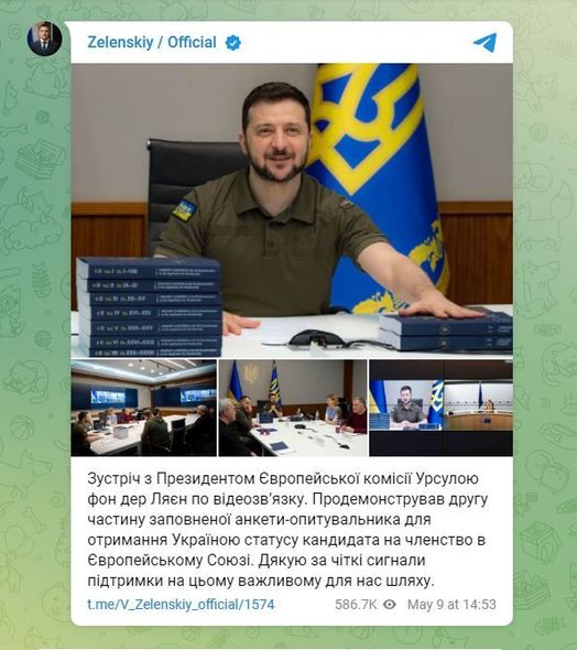 Onun sözlərinə görə, Avropa Komissiyasının rəhbəri Ursula fon der Leyenlə videogörüş olub və Avropa İttifaqına üzvlüyə namizəd statusu əldə edilməsi üçün doldurulmuş sorğunun ikinci hissəsi nümayiş edilib.